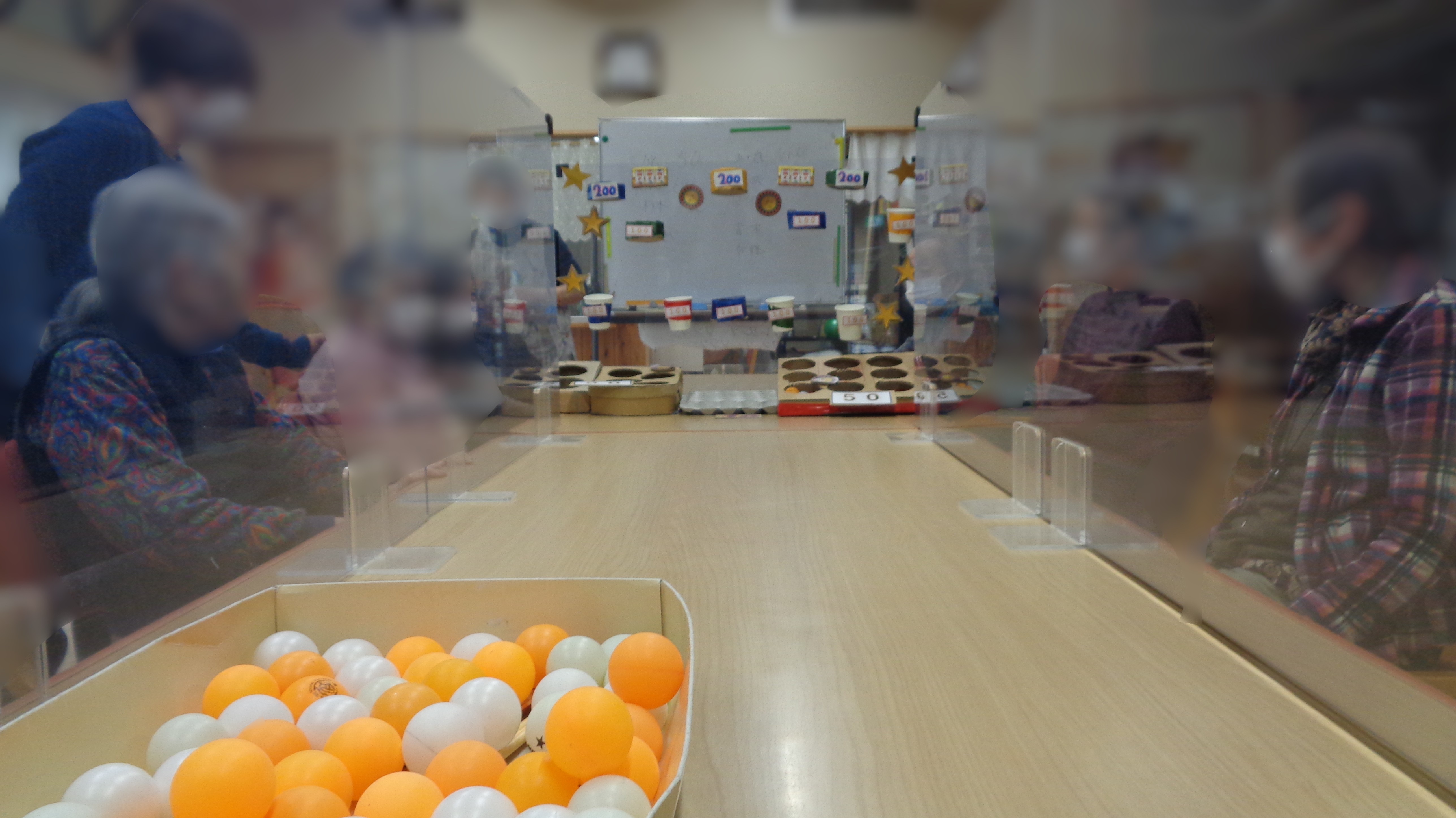 3つめは「ピンポン玉バウンドシュート」です。こちらも初登場です。写真の通りピンポン玉とゴール(穴が複数空いた段ボールと透明なボードに貼り付けたカゴ)を用いて行います。