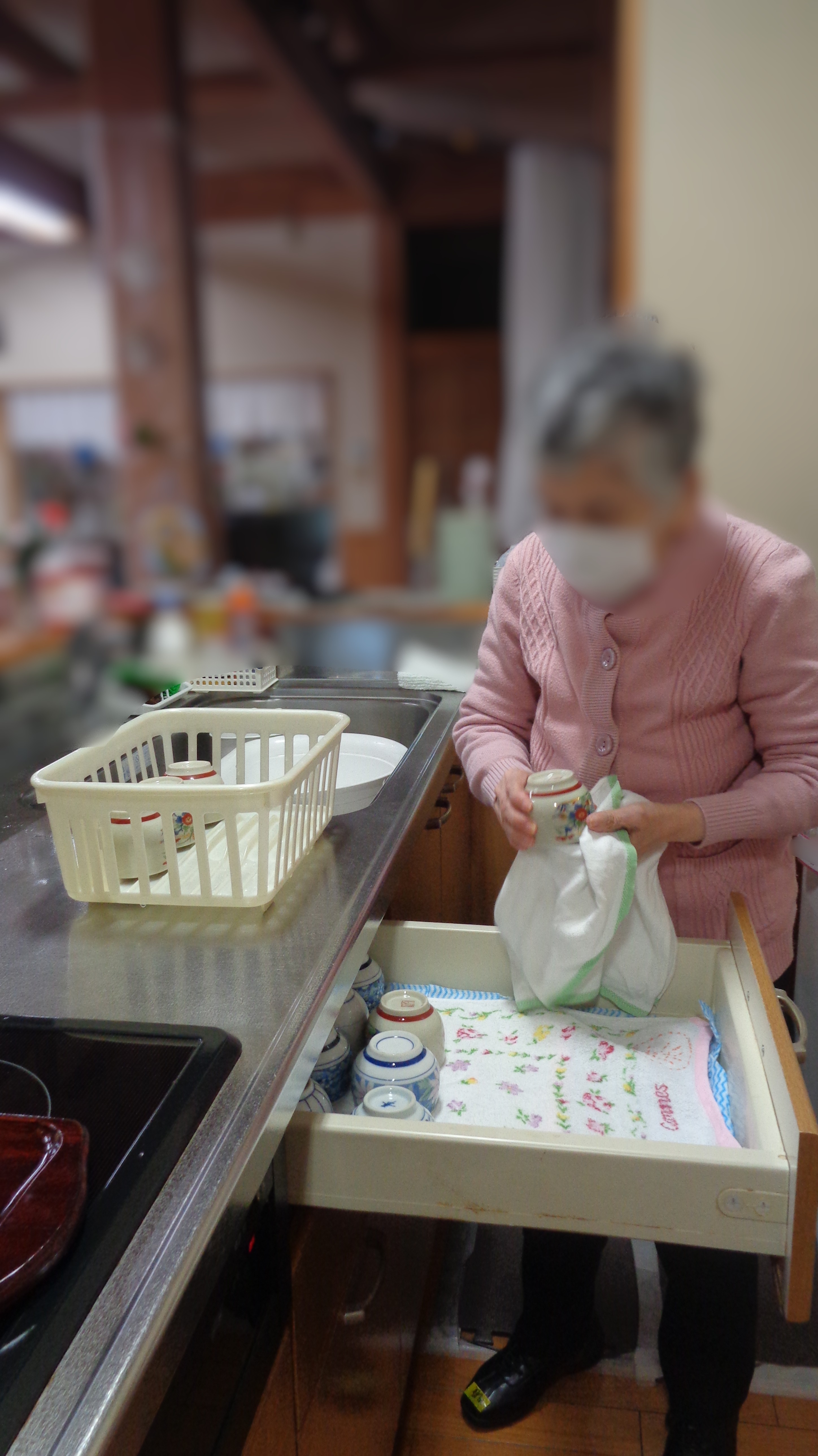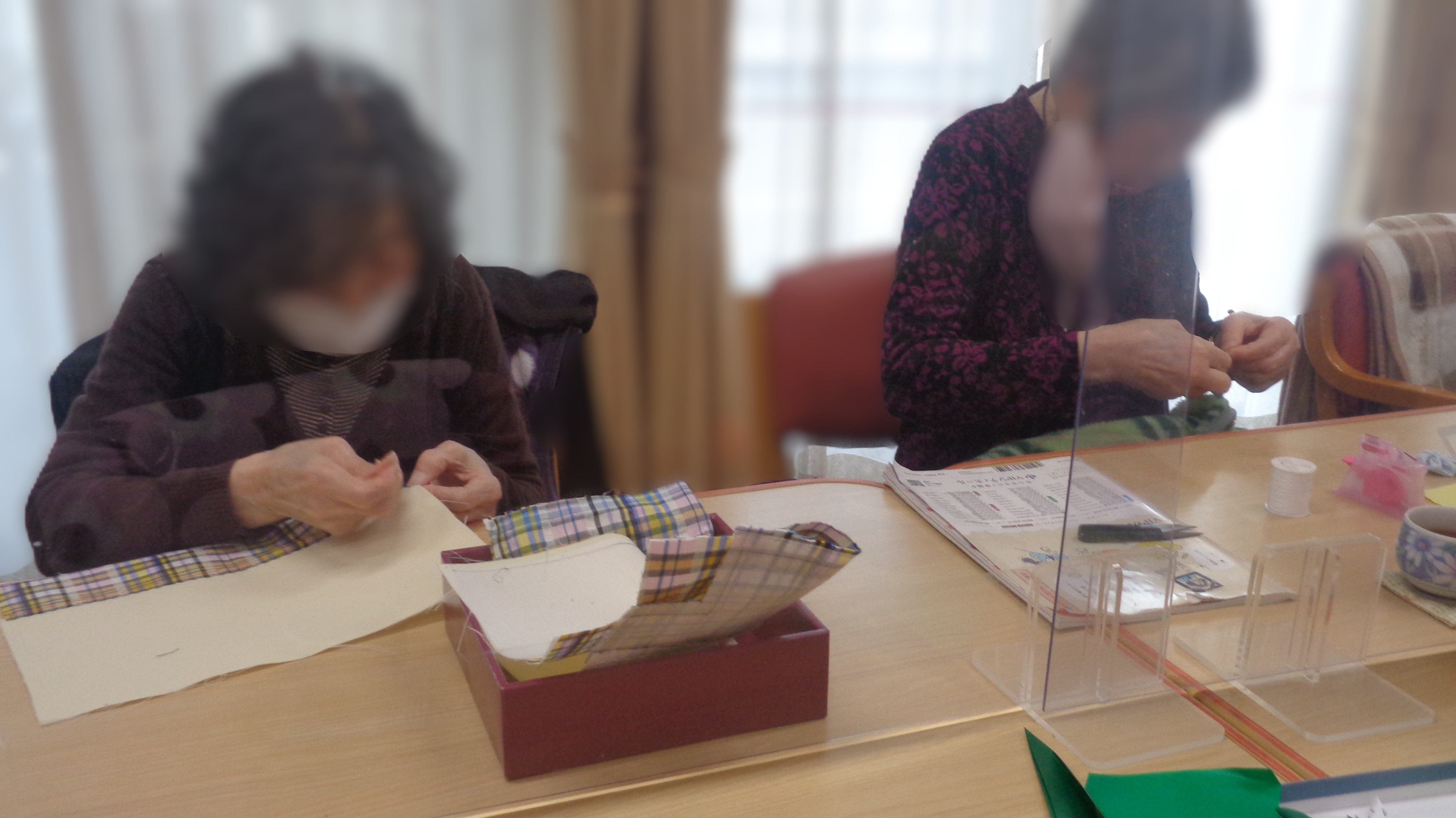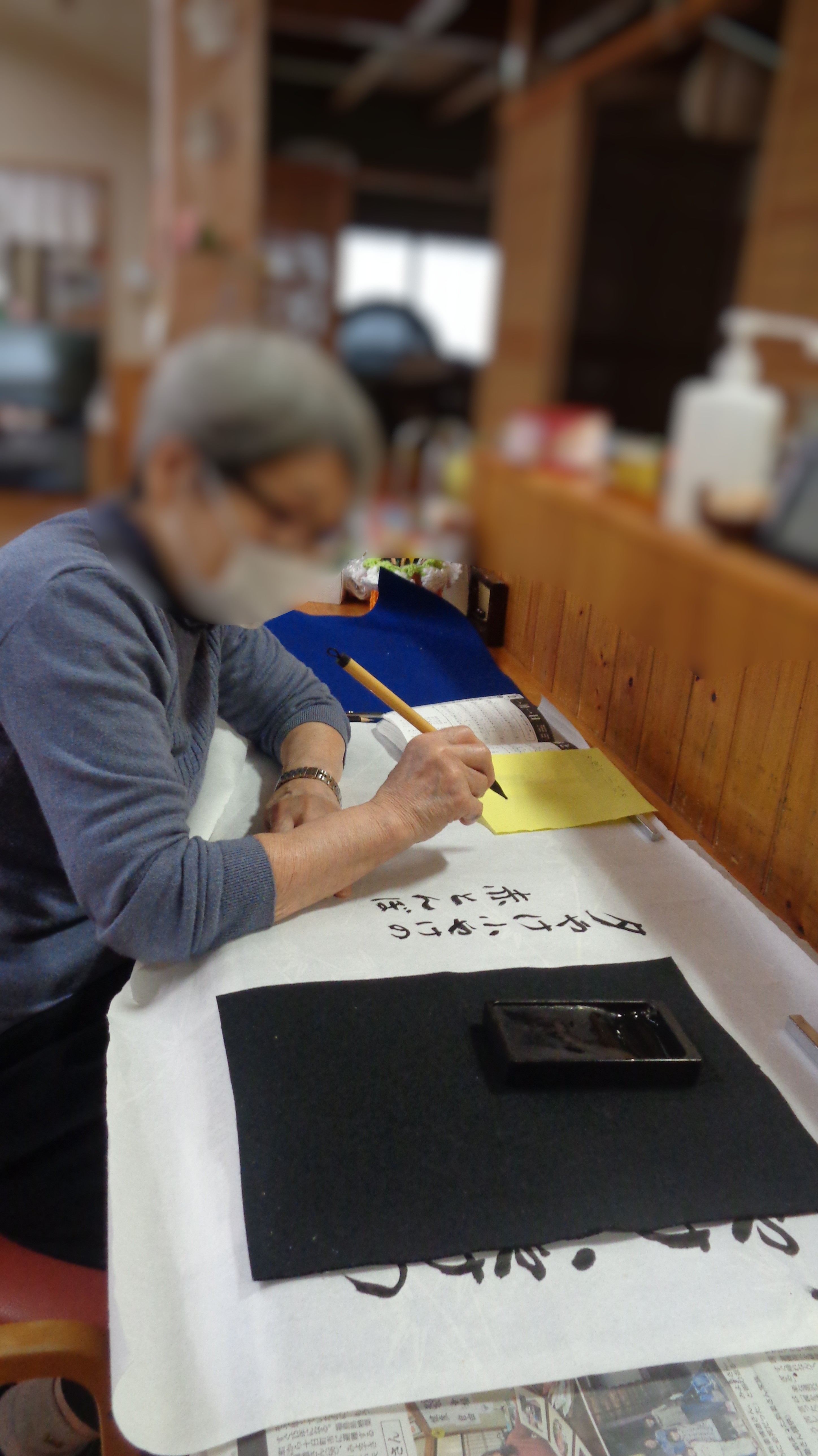 まずは午前の主な活動の様子をお届けします。恒例の朝のラジオ体操、習字、パズル、お裁縫、食器拭きなど様々なことを元気に行われていました。