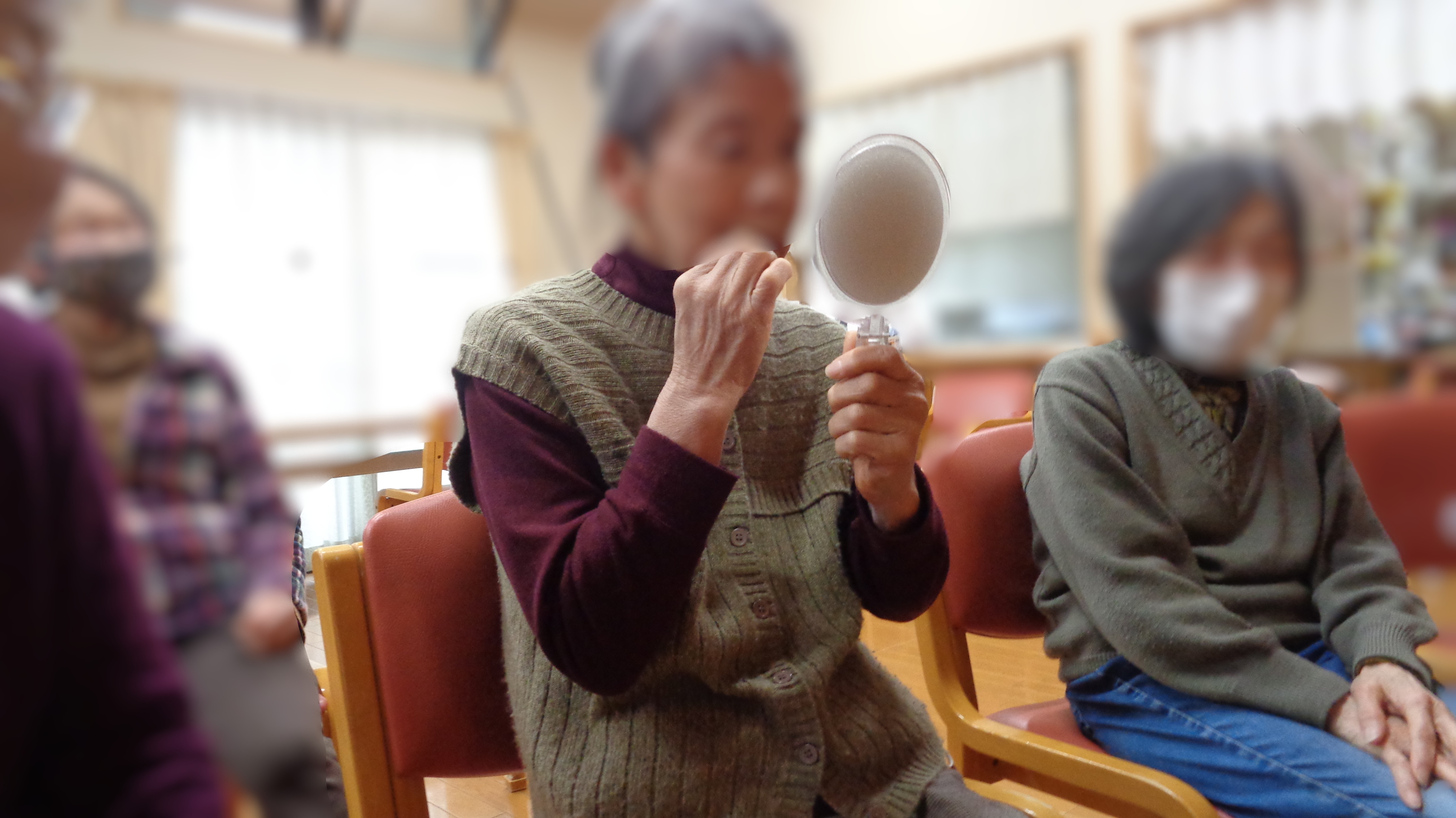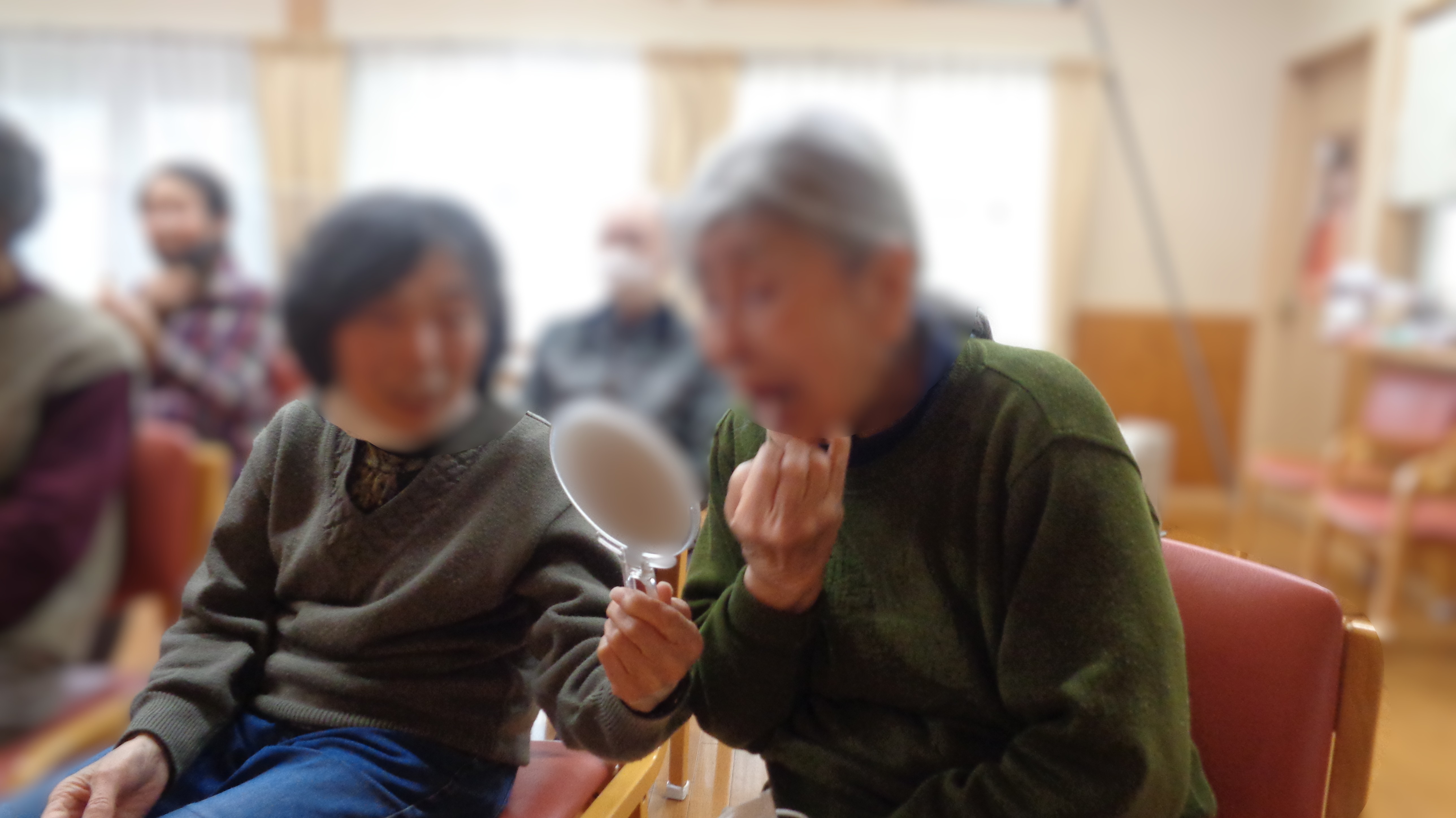 早速ですが記念撮影のため女性の利用者さんには、口紅を塗ってお化粧をしていただきました!