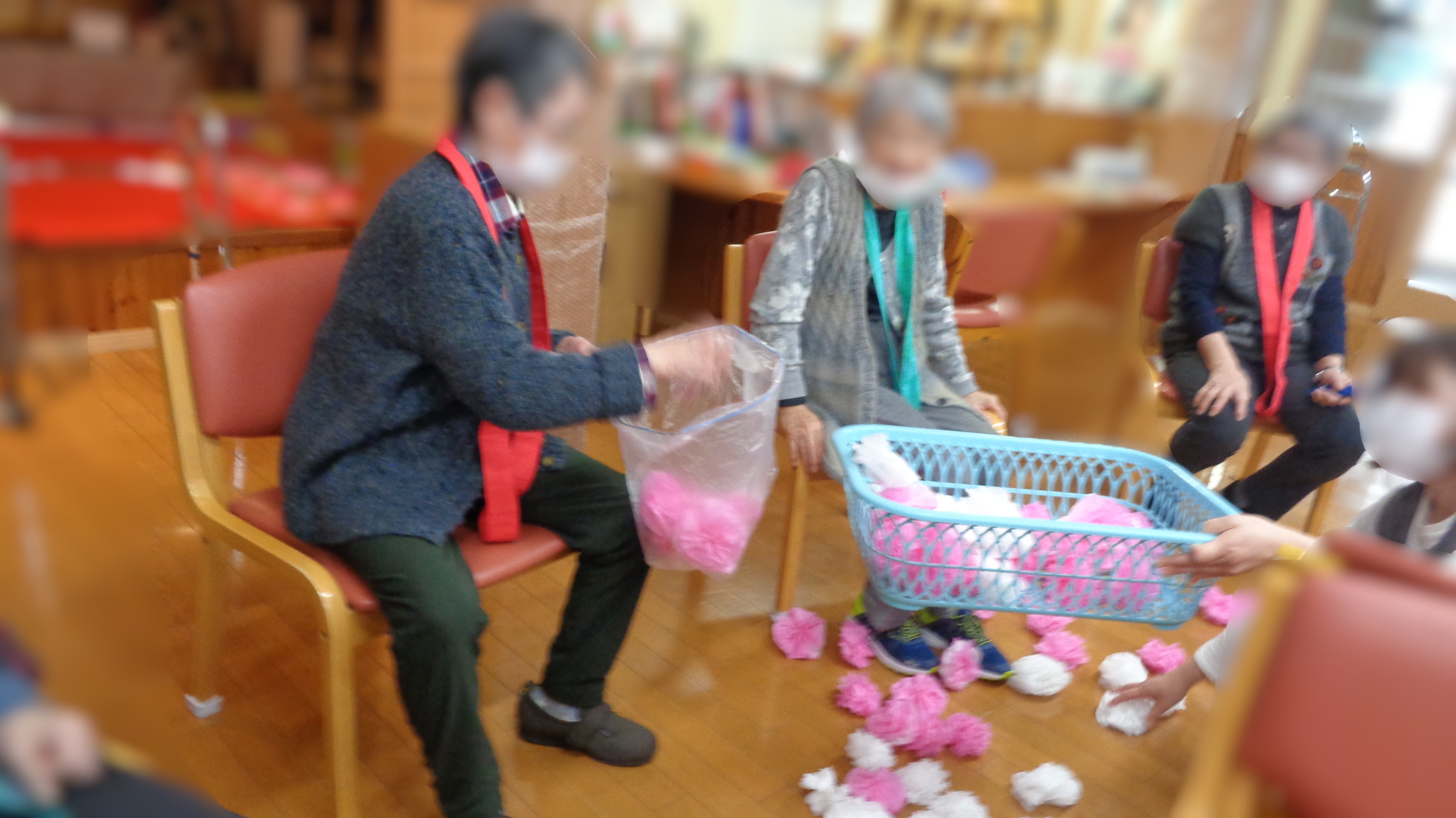 その内容は、まず赤と緑の2チームに分かれてもらい、最初にプレイをするチームに網を持ってもらいます。つぎに「よーい!スタート!」の合図で、全員で「花咲じいさん」を歌いながら、職員さんが次々と投げるボンボンを網で取りまくります!最後に「終わり!」の合図で網に入ったボンボンを数えて合計します。最終的にそれが多かったチームの勝ちです。
