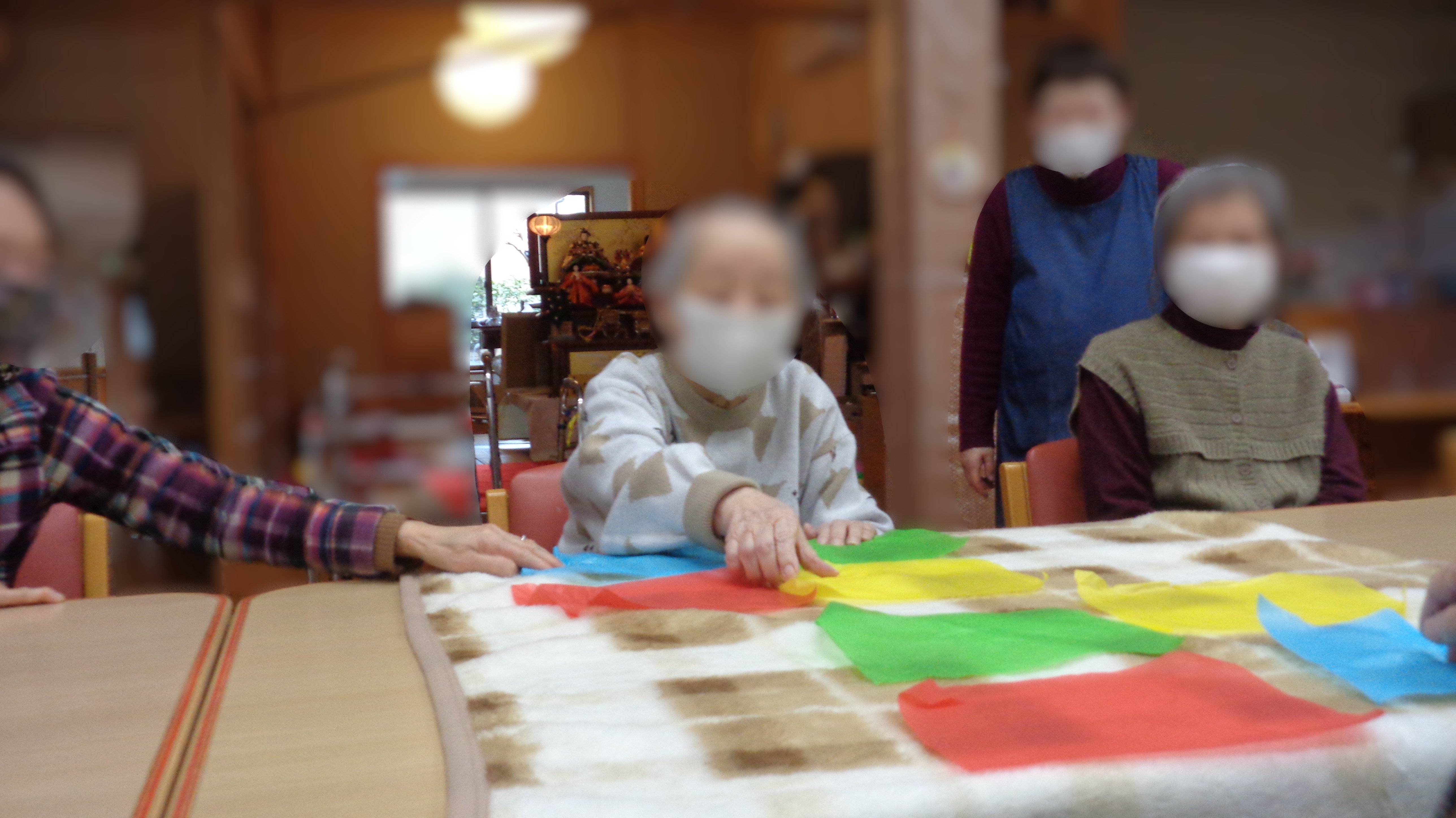 さらにお雛様になっていただくために、華やかな色の着物を着て頂きました!着付けの経験のある利用者さんのおかげでスムーズでした。
